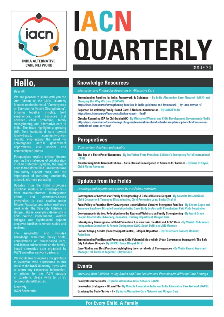 Every quarter, IACN brings to you a newsletter disseminating the latest resources, research, tools, updates from our network members, news, case studies, and events and much more related to children without parental care or at risk of separation. Please reach out to us on iacnsecretariat@iacn.in.