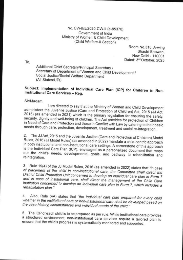 Circular Regarding Implementation of Individual Care Plan (ICP) for Children in Non-Institutional Care Services by Ministry of Women and Child Development, Government of India