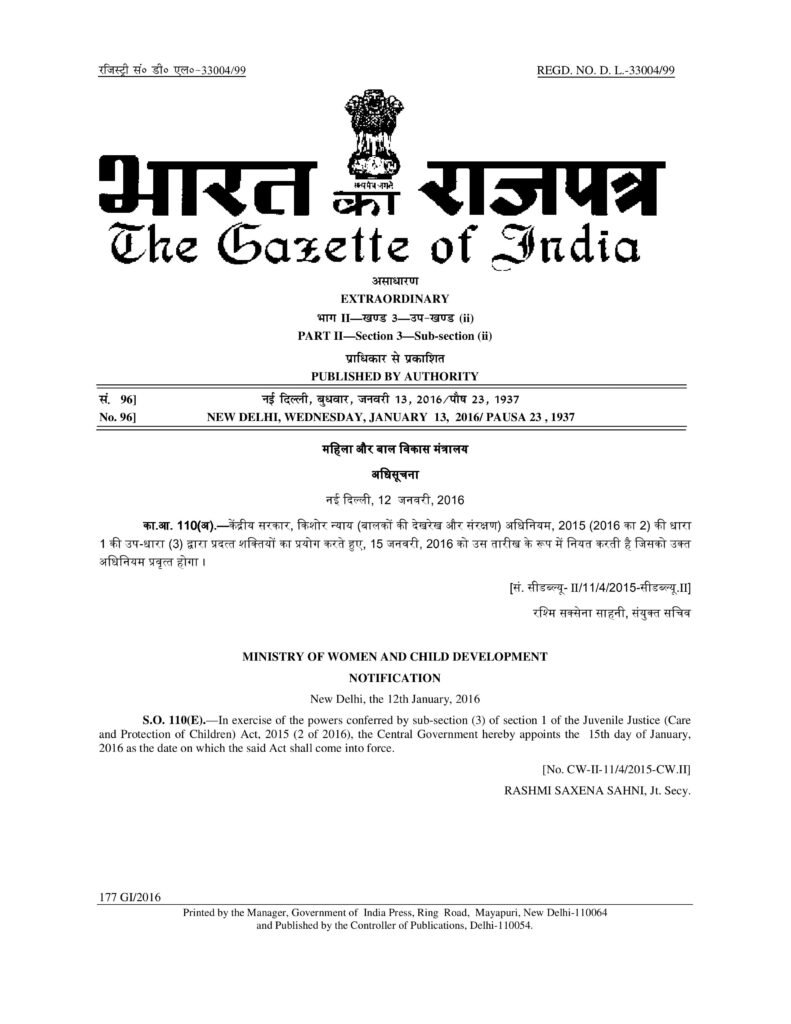 Juvenile Justice (Care and Protection) 2015, Ministry of Women and Child Development 2016