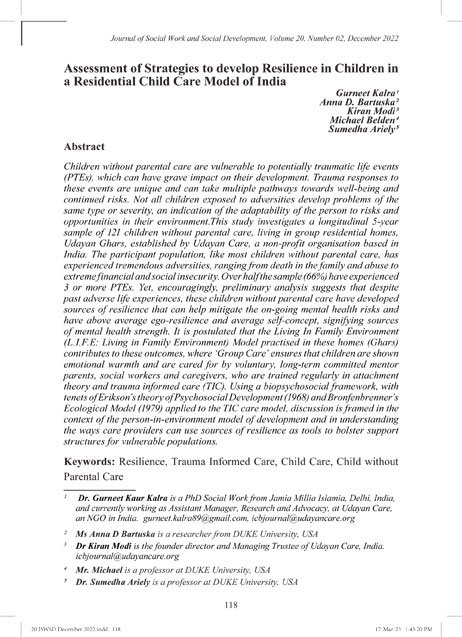 This study investigates a longitudinal 5-year sample of 121 children without parental care, living in group residential homes, Udayan Ghars, established by Udayan Care, a non-profit organisation based in India. The participant population, like most children without parental care, has experienced tre mendous adversities, ranging from death in the family and abuse to extreme financial and social insecurity.