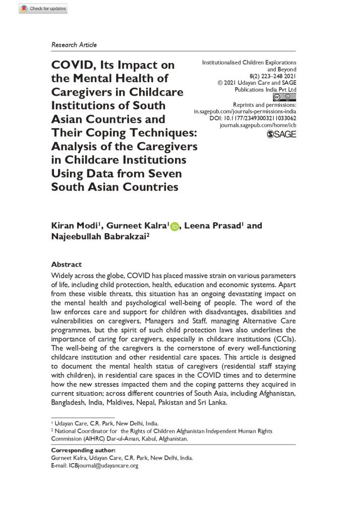 COVID, Its Impact on the Mental Health of Caregivers in Childcare Institutions of South Asian Countries and Their Coping Techniques: Analysis of the Caregivers in Childcare Institutions Using Data from Seven South Asian Countries