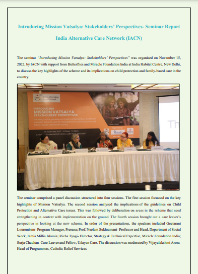 This report aims to discuss the key highlights of the seminar 'Introducing Mission Vatsalya: Stakeholders’ Perspectives' organised by IACN with support from Butterflies and Miracle Foundation India at India Habitat Centre, New Delhi. It sheds light on the scheme and its implications on child protect ion and family-based care in the country
