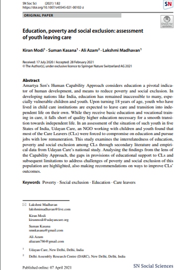 In developing nations like India, education has remained inaccessible to many, especially vulnerable children and youth. Upon turning 18 years of age, youth who have lived in child care institutions are expected to leave care and transition into independent life on their own. While they receive basi c education and vocational training in care, it falls short of the quality higher education necessary for a smooth transition towards independent living. In an assessment of the situation of such youth in five States of India, Udayan Care, an NGO working with children and youth found that most of the Care Leavers (CLs) were forced to compromise on education and pursue jobs with low remuneration. This study examines the interrelatedness of education, poverty and social exclusion among CLs through secondary literature and empirical data from Udayan Care’s national study. Analysing the findings from the lens of the Capability Approach, the gaps in provisions of educational support to CLs and subsequent limitations to address challenges of poverty and social exclusion of this population are highlighted, also making recommendations on ways to improve CLs’ outcomes