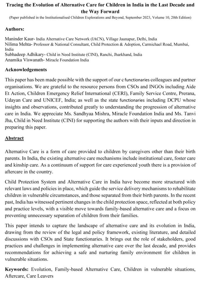This paper intends to capture the landscape of alternative care and its evolution in India, drawing from the review of the legal and policy framework, existing literature, and detailed discussions with CSOs and State functionaries. It brings out the role of stakeholders, good practices and challenge s in implementing alternative care over the last decade, and provides recommendations for achieving a safe and nurturing family environment for children in vulnerable situations.
