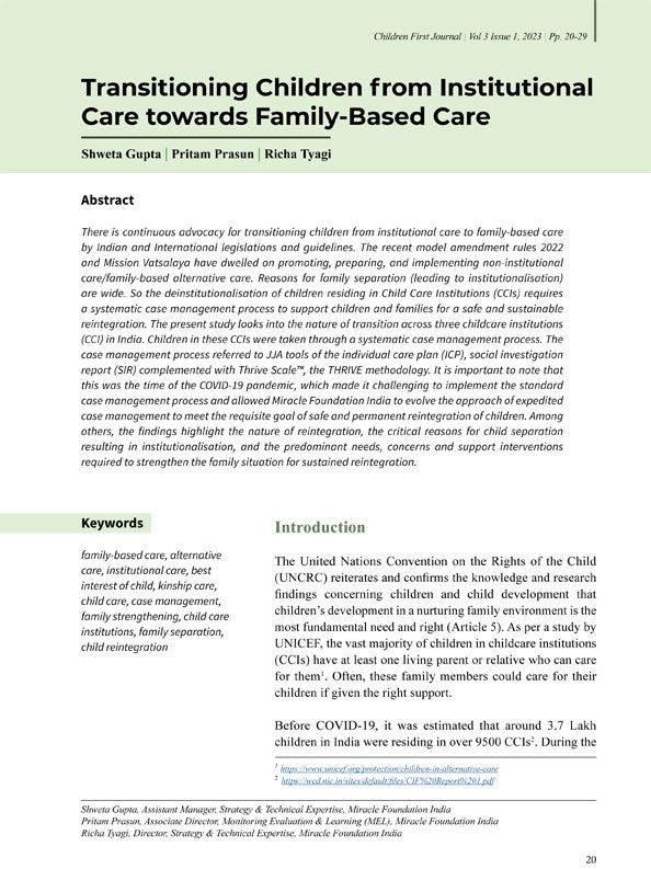 The present study looks into the nature of transition across three childcare institutions (CCI) in India. Children in these CCIs were taken through a systematic case management process. The case management process referred to JJA tools of the individual care plan (ICP), social investigation report ( SIR) complemented with Thrive Scale™, the THRIVE methodology. It is important to note that this was the time of the COVID-19 pandemic, which made it challenging to implement the standard case management process and allowed Miracle Foundation India to evolve the approach of expedited case management to meet the requisite goal of safe and permanent reintegration of children.