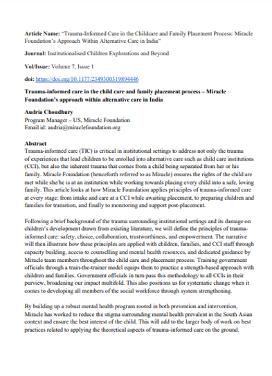 Trauma-informed care (TIC) is critical in institutional settings to address not only the trauma of experiences that lead children to be enrolled into alternative care such as child care institutions (CCI), but also the inherent trauma that comes from a child being separated from her or his family. M iracle Foundation (henceforth referred to as Miracle) ensures the rights of the child are met while she/he is at an institution while working towards placing every child into a safe, loving family. This article looks at how Miracle Foundation applies principles of trauma-informed care at every stage: from intake and care at a CCI while awaiting placement, to preparing children and families for transition, and finally to monitoring and support post-placement. Following a brief background of the trauma surrounding institutional settings and its damage on children’s development drawn from existing literature, we will define the principles of traumainformed care: safety, choice, collaboration, trustworthiness, and empowerment. The narrative will then illustrate how these principles are applied with children, families, and CCI staff through capacity building, access to counselling and mental health resources, and dedicated guidance by Miracle team members throughout the child care and placement process. Training government officials through a train-the-trainer model equips them to practice a strength-based approach with children and families. Government officials in turn pass this methodology to all CCIs in their purview, broadening our impact multifold. This also positions us for systematic change when it comes to developing all members of the social workforce through system strengthening. By building up a robust mental health program rooted in both prevention and intervention, Miracle has worked to reduce the stigma surrounding mental health prevalent in the South Asian context and ensure the best interest of the child. This will add to the larger body of work on best practices related to applying the theoretical aspects of trauma-informed care on the ground.