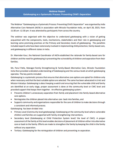 The Webinar “Gatekeeping as a Systematic Process: Preventing Child’s Separation” was organised by India Alternative Care Network (IACN) in association with Miracle Foundation India, on April 28, 2023 and was attended by participants from across the country. The webinar was organised with the objecti ve to understand gatekeeping with a vision of getting acquainted with the components, tools, mechanisms, stakeholders and their role in gatekeeping and learning some promising practices at the Primary and Secondary levels of gatekeeping. This report presents key learnings from the webinar.