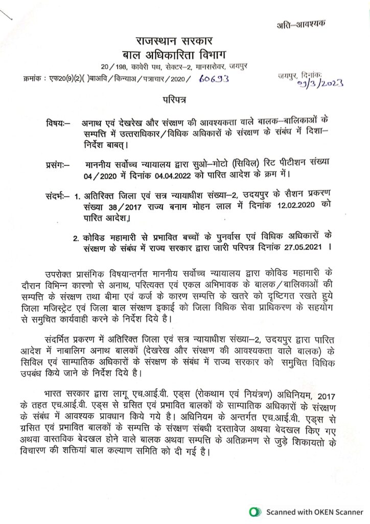 Circular for Protection of Child_s Property, Rajasthan